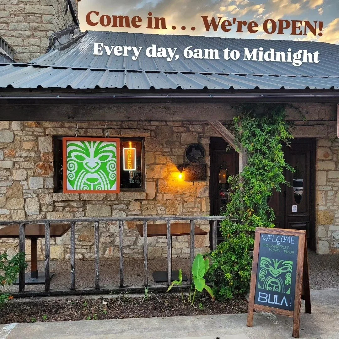 SquareRüt Kava Bar's Oak Hill location, situated in the historic Old Rock Store (formerly Austin Pizza Garden), is a community-focused "sober-curious" hub in South Austin. It offers a unique combination of traditional kava, specialty coffee, and wood-fired pizza in a family-friendly environment that includes a large backyard with a playground.
